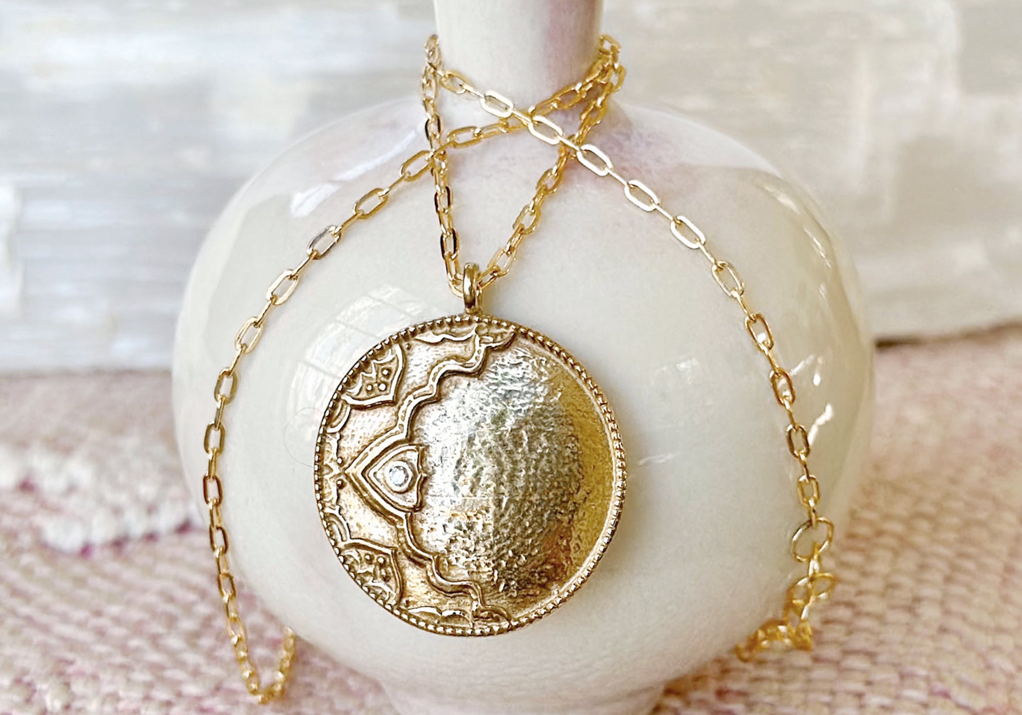 Be like the moon and make change beautiful. Our Ayla Necklace pays homage to the moon’s phases with its crescent outlined in a beautiful textile pattern within a round pendant of a full moon.