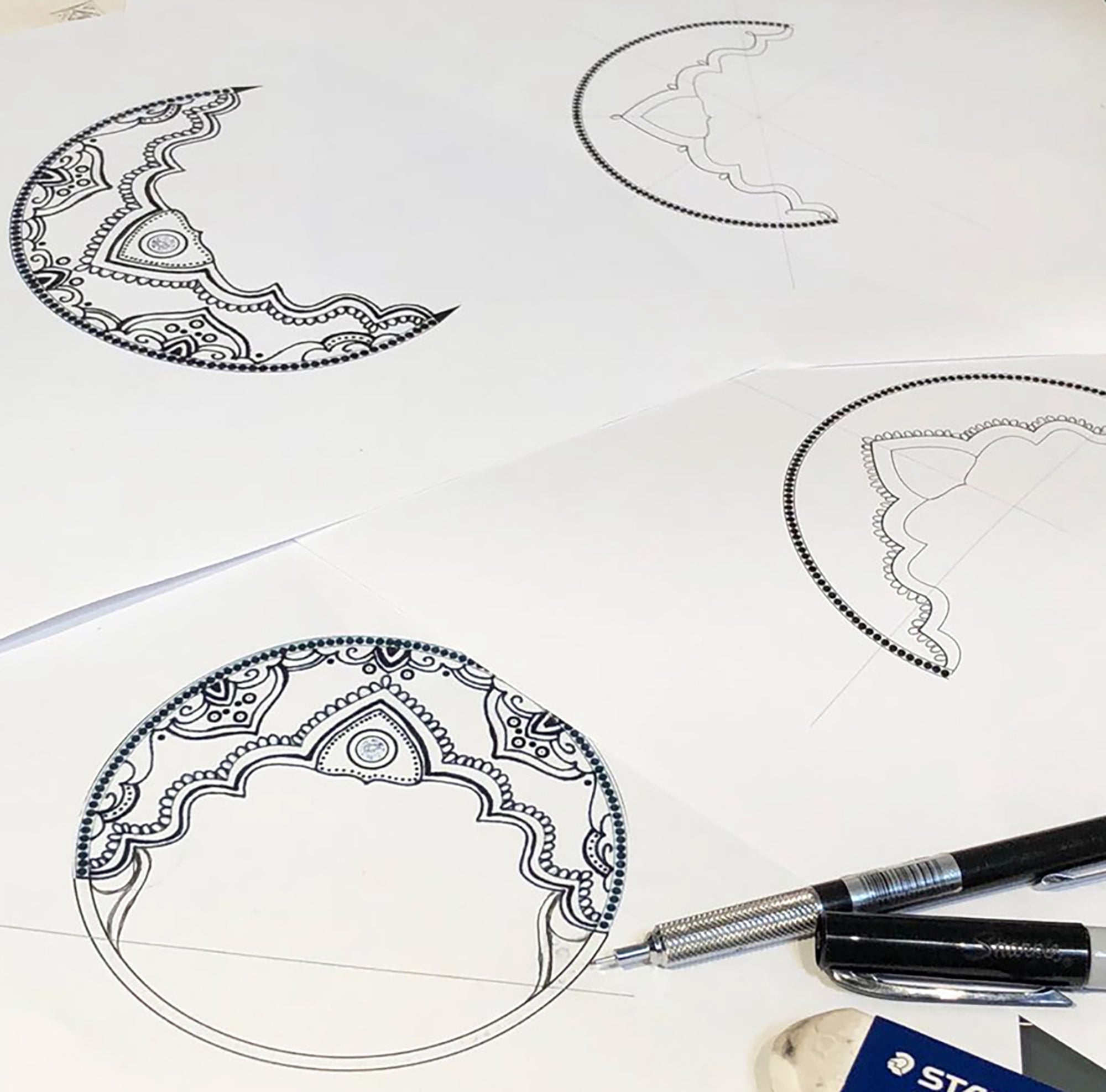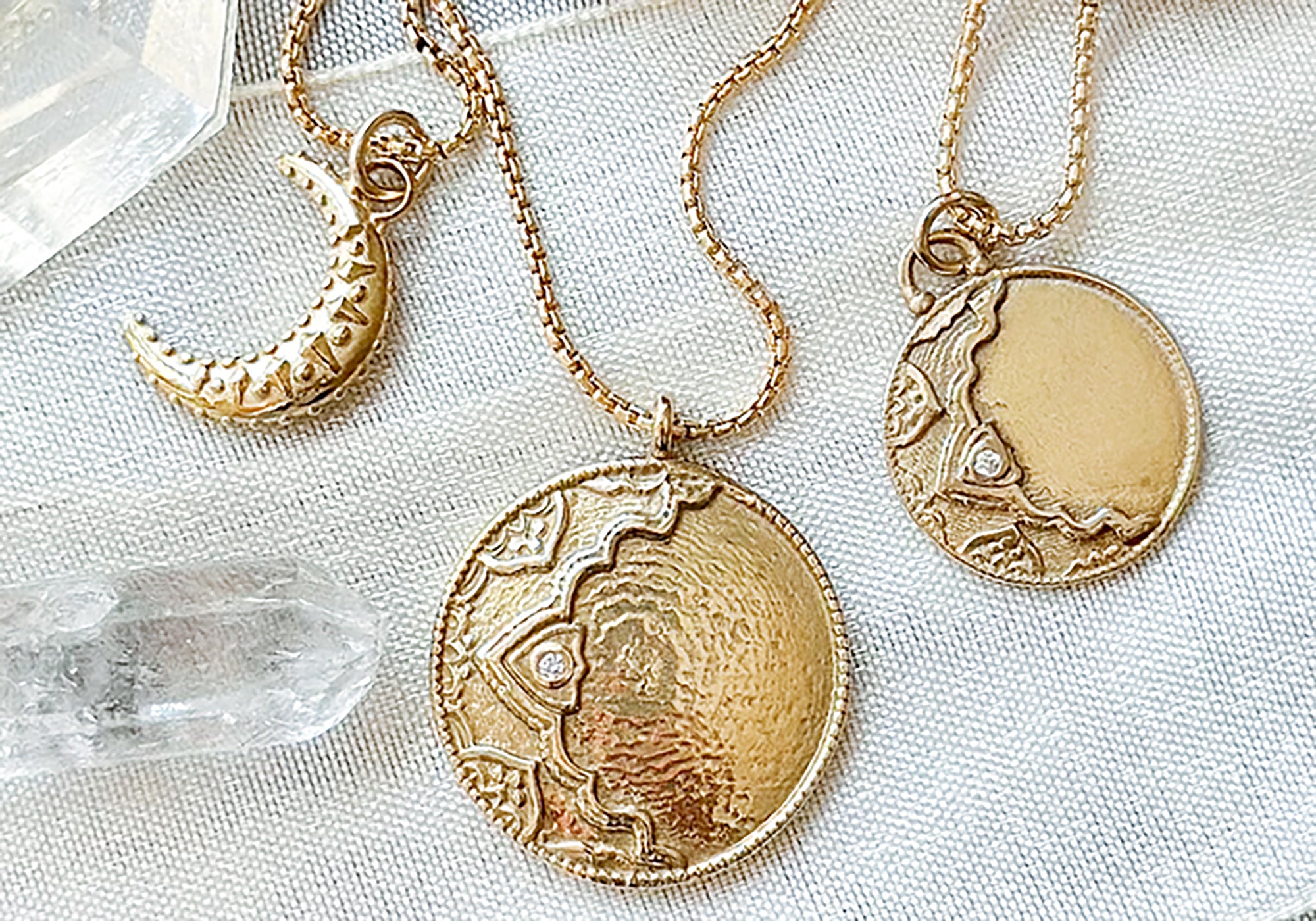 At first, the design was purely crescent-shaped, but Kristina’s exquisite execution of the illustration sparked an idea—Stacy suggested encircling the crescent with a halo, creating a round medallion that would capture both the crescent and full moon in one luminous form. The result was a unique fusion of shadow and light, embodying the ever-changing beauty of the lunar cycle.